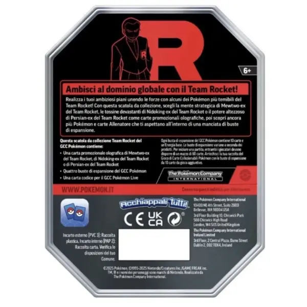 Questa speciale Team Rocket Tin celebra l’estetica oscura e ambiziosa del Team Rocket, offrendo una carta promozionale esclusiva e una selezione di buste di espansione del Gioco di Carte Collezionabili Pokémon.